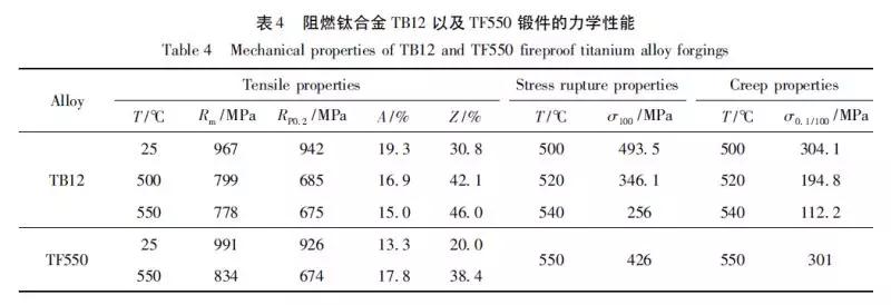 從表4 可見,TF550 鈦合金鍛件的高溫持久和蠕變性能顯著優于TB12 鈦合金。