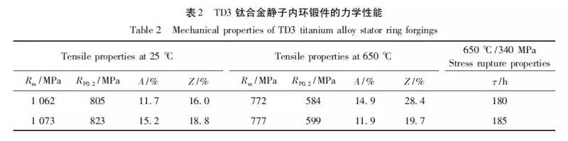 1. 4 整環和半環鍛件研制。以機匣、內環、安裝邊等為代表的環形件結構也是航空發動機中比較重要的結構形式,環鍛件通常采用軋制工藝制造,主要工序為棒材坯料鐓粗、沖孔、擴孔和最終的軋制成形。通常,坯料沖孔后得到的環坯進一步擴孔和最終的軋制成形都是在擴孔機上完成的。高溫鈦合金以及Ti3Al、Ti2AlNb 合金環鍛件制備都能夠采用這種工藝路線,在環鍛件制備的4 個工序過程中,坯料的加熱溫度、擴孔和最終軋制成形的變形量控制決定了環鍛件的組織類型,通過固溶、時效處理可以進一步調控環鍛件的微觀組織,獲得所需的力學性能。圖7 和表2 分別為TD3 鈦合金靜子內環鍛件及其力學性能。可見,TD3 鈦合金靜子內環鍛件的室溫和650 ℃力學性能均比較好。 圖7 TD3 鈦合金靜子內環鍛件照片 Fig. 7 Photo of TD3 titanium alloy stator ring forgings 相近變形條件下,TB12 和TF550 阻燃鈦合金的變形抗力顯著高于普通鈦合金,甚至也高于Ti-Al 系金屬間化合物合金,如表3 所示。可見,阻燃鈦合金環鍛件制備難度非常大。在成形外徑為730 mm、高度為300 mm 的TB12 鈦合金大型機匣環鍛件時,遇到的最大問題就是擴孔機噸位不足,坯料沖孔后得到的環坯徑向截面厚度仍較大,不能在擴孔機上直接進行擴孔,只能采用變形條件比較差的馬架擴孔工藝將環坯的徑向截面尺寸先進行減薄,然后再在擴孔機上完成環鍛件的軋制成形,圖8a 為TB12鈦合金軋制成形的機匣環鍛件。