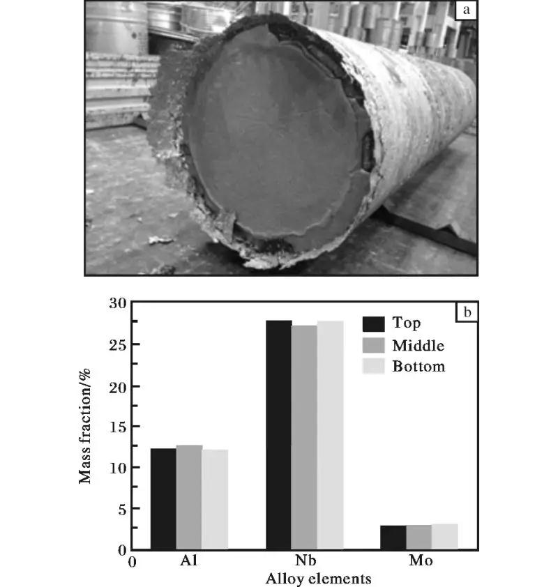 圖1 TD3 鈦合金鑄錠( 600 mm) 照片及化學成分 Fig. 1 Photo of 600 mm TD3 titanium alloy ingot( a) and chemical composition( b)