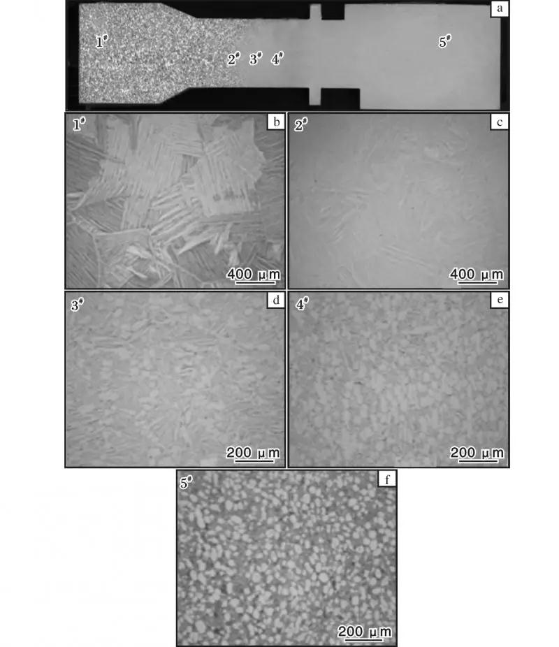 鈦合金盤和葉片一體化制造在組織性能控制上做了一種工藝上的妥協,為了能夠充分發揮高溫鈦合金各種微觀組織形態或合金最優勢的性能,近些年嘗試開展了雙合金整體葉盤以及雙性能整體葉盤的研制工作,主要包括: ①線性摩擦焊工藝,理論上可以實現雙合金或是同一合金雙組織整體葉盤的連接,國內外的研究工作主要集中于線性摩擦焊工藝和接頭組織性能的研究; ②真空電子束焊接+ 近等溫鍛造+ 熱處理強化界面的復合工藝,西北工業大學采用這種工藝開展了Ti3Al /TC4、Ti3Al /TC11、Ti2AlNb /TC11、Ti2AlNb /Ti60雙合金盤研制的基礎研究和組織性能評估; ③分區控溫鍛造和分區控溫熱處理工藝,理論上能夠將整體葉盤鍛件中葉片與盤體控制為不同的組織類型,以更好地滿足整體葉盤不同部位實際服役條件的要求。圖6為TA29 鈦合金 圖6 TA29 鈦合金雙性能整體葉盤鍛件徑向截面 低倍組織和顯微組織 Fig. 6 Radial section macrostructure( a) and microstructures( b ~ f) of TA29 titanium alloy dual-property blisk die forging
