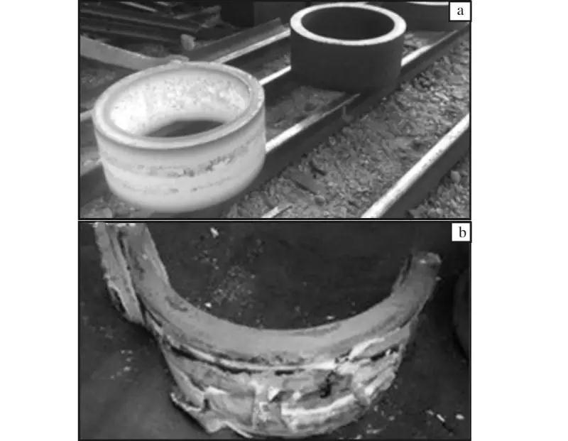 Ti-V-Cr 系阻燃鈦合金的顯著特點是鑄造組織狀態下工藝塑性非常低,基本不能實現無約束條件下自由鍛造。2009—2010 年,北京航空材料研究院與北方重工合作,在360MN 擠壓機上實現了TB12 和TF550 鈦合金多個3 t 級鑄錠的包套擠壓開坯。圖2為