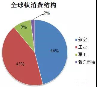 2011年,全球商業航空的消費比例達到46%,軍用鈦材比例為9%(主要為軍用航空),整個航空領域消耗鈦材比例超50%;工業消耗鈦材比例為43%,新興市場消費鈦材比例為2%。 鈦制品需求結構在地區上存在明顯差異。在擁有發達的航空航天和軍工國防工業的北美和歐盟地區,尤其是美國,大約50%以上的鈦制品需求來自于航空航天和軍工國防領域。而在日本,來自化工等行業的工業用鈦占據了需求的主導地位。據日本鈦協會統計,航空航天只占到日本鈦需求的2%-3%。與日本的情況頗為類似,我國鈦制品需求大部分來自化工和能源領域,航空航天只占到10%。雖說中國已成為全球最大的鈦金屬生產國和消費國之一,不過大部分生產一直局限于等級較低的鈦,用于自行車架、高爾夫球桿或化工行業使用的防腐管材。但是近年來航空航天用鈦量在亞洲地區出現明顯增長,可見,鈦市場的前景比較光明。